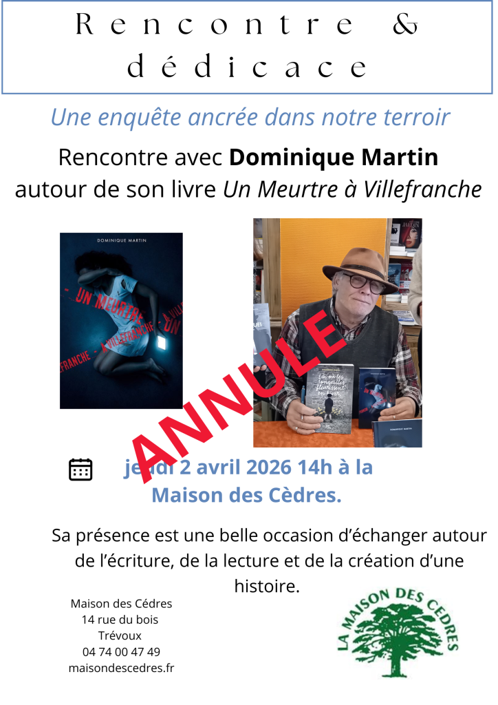 L’assemblée Générale de la Maison des Cèdres aura lieu le vendredi 3 avril 2026 à 14h à la salle Paul Desplaces.